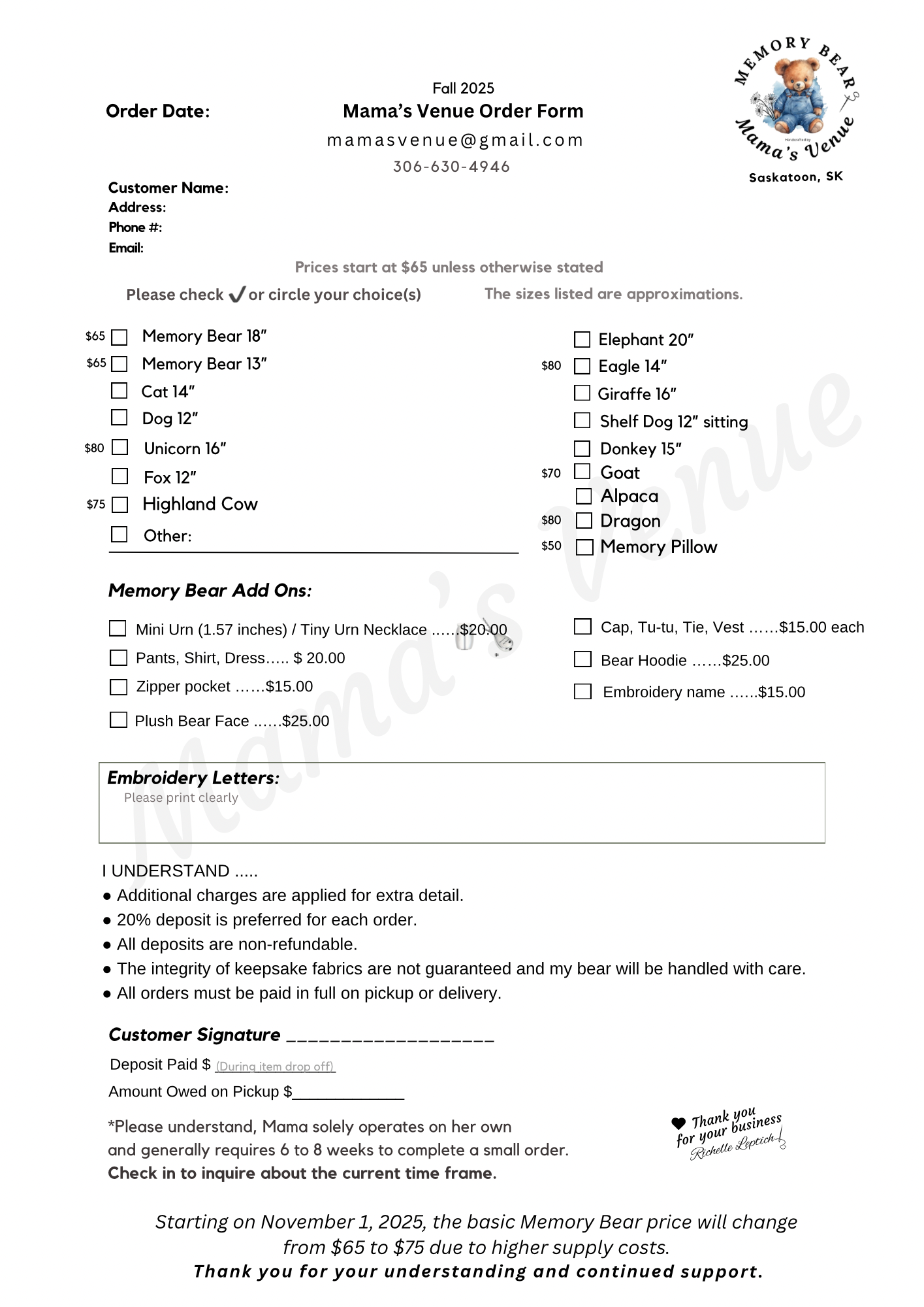 * Download the order form and select the size and style for your custom Memory Bear. "Please remember to mention any additional embellishments for your memory bear to enhance its uniqueness and personal significance."