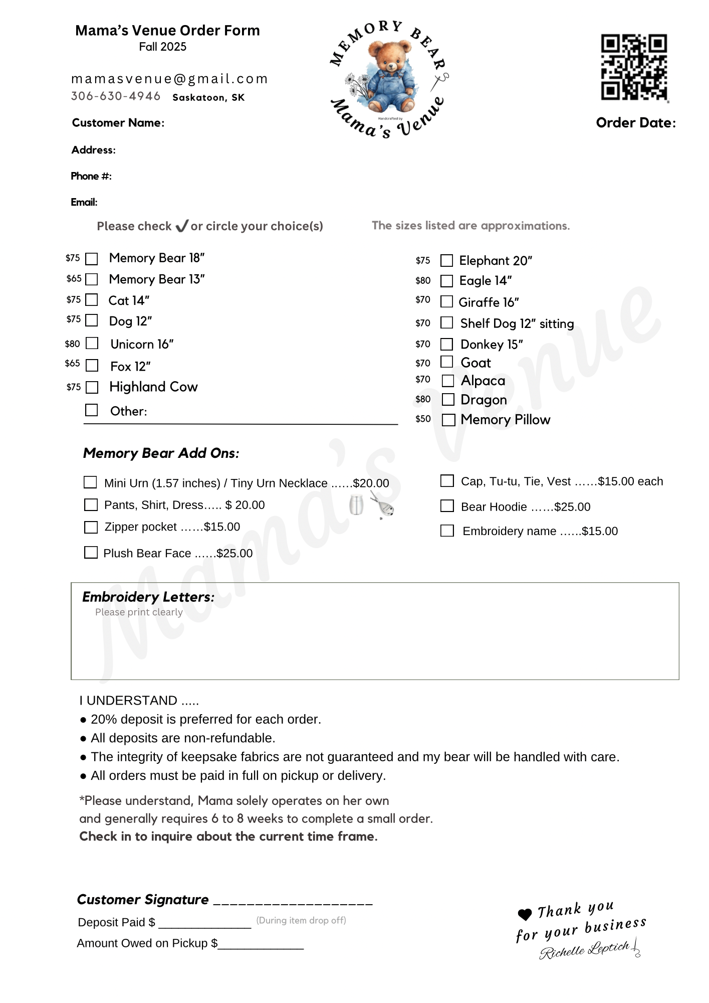 * Secure your order by emailing a 20% deposit via e-transfer along with your completed form.